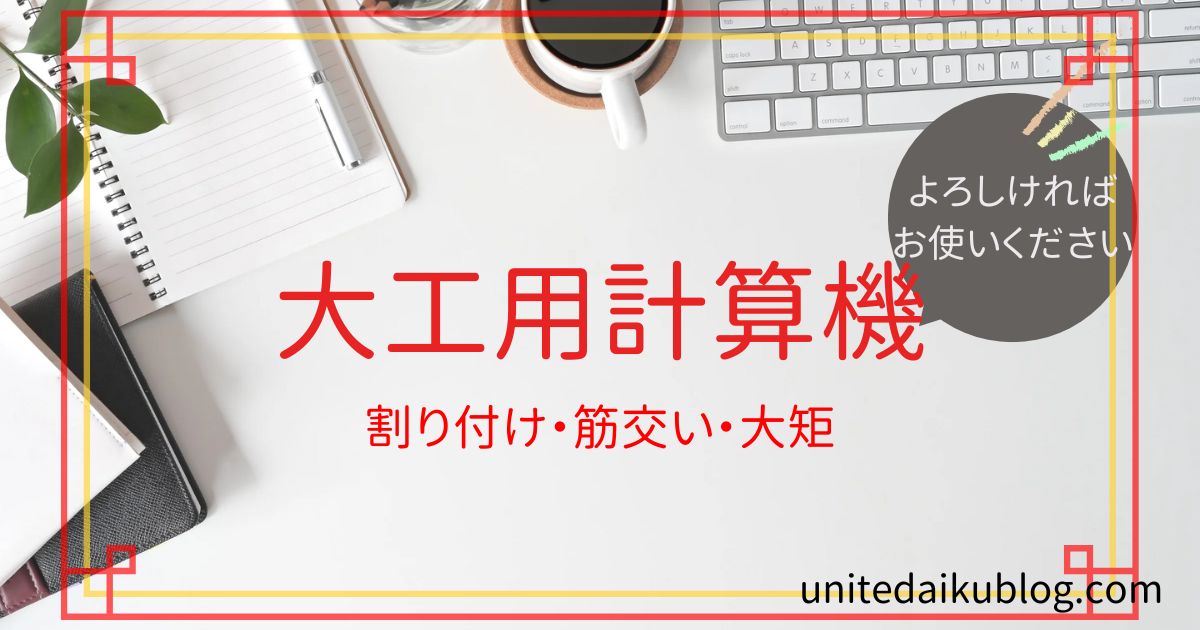 大工用計算機 大工用計算機 Twitter Facebook はてブ Pocket LINE コピー 2025.10.01 2025.09.25 大工用計算機 実際の施工・設計においては必ず専門家の確認を行ってください。 利用は自己責任でお願いします。 目次 筋交い筋交い長さ筋交い角度(x/100)大矩割付け 筋交い 筋交い長さ 内法タテ 内法ヨコ 長さ = 0.000 筋交い角度(x/100) 内法ヨコ ÷ 内法タテ ×100 = 0.000 /100 大矩 長辺 短辺 斜め長さ = 0.000 割付け 現場の総長さ 加工品の働き幅 1枚目幅 = 0.000 枚数 = 0(ロス率0.99考慮)